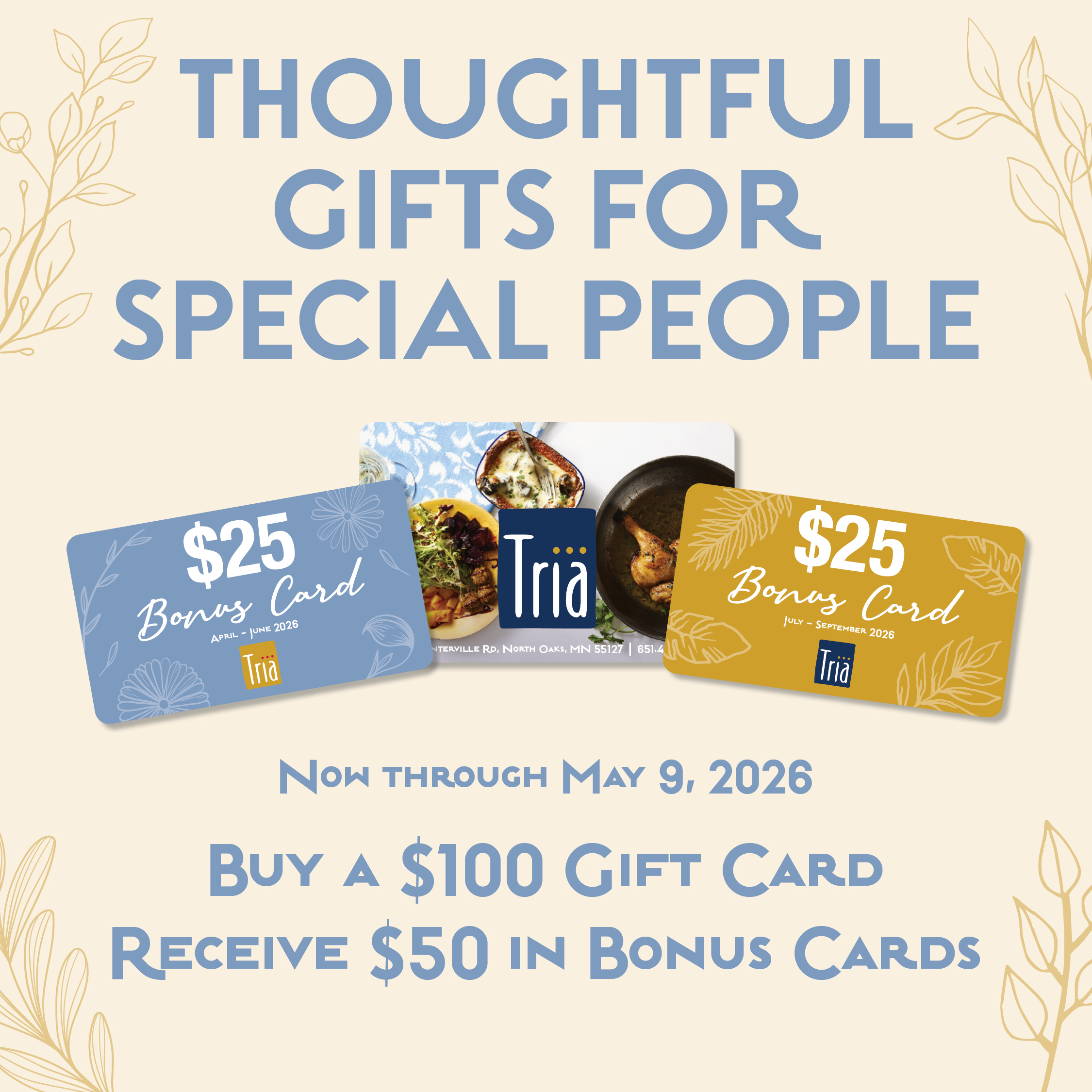 Spring Gift Card Promotion: Buy a $100 physical gift card and receive $50 in bonus cards! Purchase gift cards here.