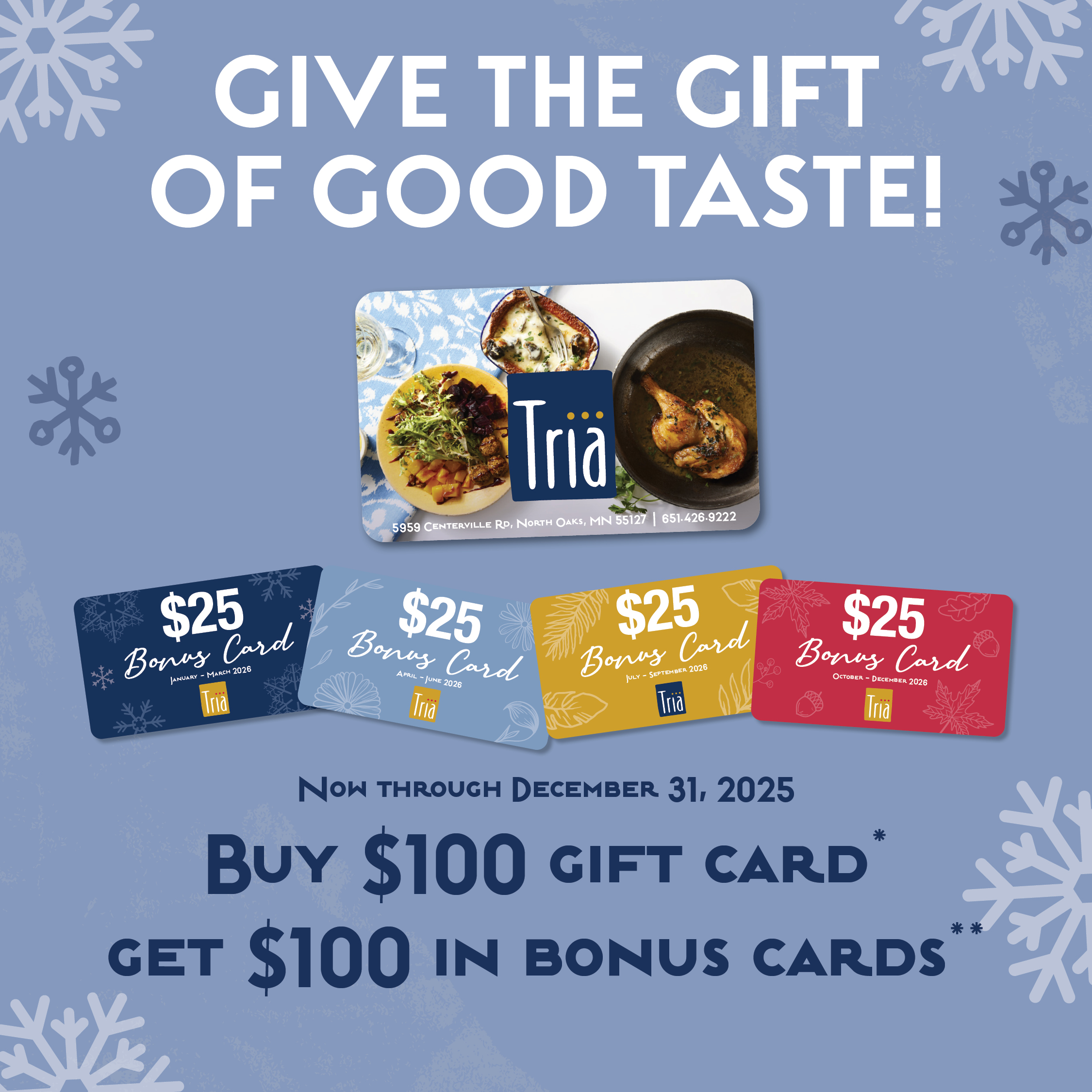 **Promotional bonus cards hold no cash value, nor will credit be applied for any balances. Not valid with other offers or promotions. Can use one bonus card per check. Tria Restaurant and Morrissey Hospitality are not responsible for lost or stolen cards. Valid for purchases in each quarter of 2026.